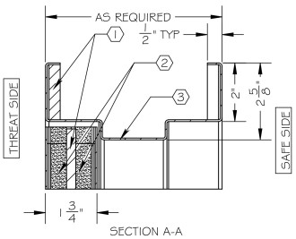 Bullet Resistant Hollow Metal door and frame assemblies are designed of “non-ricochet type” intended to permit capture and retention of attacking projectile, lessening potential of random injury or lateral penetration. Frame uses cold rolled steel prime painted steel which is cut then broken and welded to size. Frames includes armor installed in 2″ face to meet ballistic protection level. Door uses cold rolled steel prime painted steel skins with channel supported edges with ballistic armor and foam insulation inserted to meet ballistic protection level required. Assembly leaves factory swinging on frame using heavy duty clear anodized aluminum continuous gear hinge prepped for cylinder, mortise lockset or exit device.