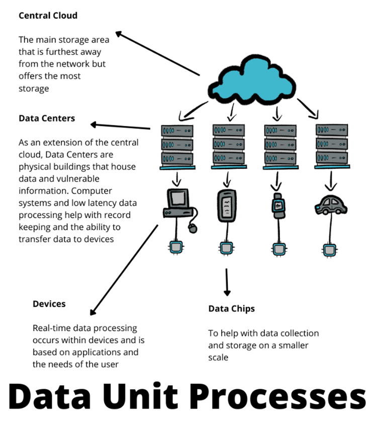 As you can see above, there are different systems in which your data can be stored and then moved onto devices and data chips. Data centers operate as physical storage units. They house large computer systems that can be an extension of the cloud network. Modern data centers need to accommodate a lot of expensive electronics and sometimes even their own power systems. That way they can provide latency-sensitive data that can react to real-time events.