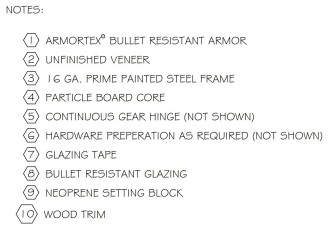 Bullet Resistant Wood Veneered door and hollow metal frame assemblies are designed for “non-ricochet type” intended to permit capture and retention of attacking projectile, lessening the potential of random injury or lateral penetration. The frame is built with cold rolled steel prime painted steel which is cut, then broken, and welded to size. Frames include armor installed in 2″ face to meet ballistic protection level. Our doors have fiberglass armor core with particle board and are veneer including door skins and edge molding. Ballistic level 1 thru 3 are 1 3/4″ thick and ballistic level 4 through 8 are 2″ + thick. Our wood door assembly leaves the factory swinging on its frame using heavy duty clear anodized aluminum continuous gear hinge prepped for cylinder, mortise lockset, or exit device.