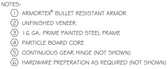 Bullet Resistant Wood Veneered door and hollow metal frame assemblies are designed for “non-ricochet type” intended to permit capture and retention of attacking projectile, lessening the potential of random injury or lateral penetration. The frame is built with cold rolled steel prime painted steel which is cut, then broken, and welded to size. Frames include armor installed in 2″ face to meet ballistic protection level. Our doors have fiberglass armor core with particle board and are veneer including door skins and edge molding. Ballistic level 1 thru 3 are 1 3/4″ thick and ballistic level 4 through 8 are 2″ + thick. Our wood door assembly leaves the factory swinging on its frame using heavy duty clear anodized aluminum continuous gear hinge prepped for cylinder, mortise lockset, or exit device.