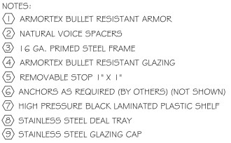 Bullet Resistant Hollow Metal Window Frames are designed for “non-ricochet type” intended to permit capture and retention of attacking projectile, lessening potential of random injury or lateral penetration. Framing system uses cold rolled steel prime painted or stainless steel cut, broken and welded to size which include armor to meet protection level required. Interior screw applied stops, making glazing installation easy for variety of glazing types and thickness to provide security level needed. Transaction windows can come with natural voice which allows voice transmission around glazing through the frame or NO natural voice to include electronic or passive speakers. Transaction windows are also available with a laminate, stainless steel counters or can be made to install on existing counters.
