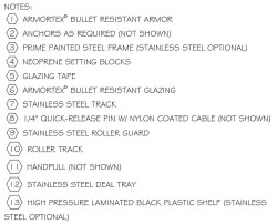Bullet Resistant Hollow Metal Window Frames are designed for “non-ricochet type” intended to permit capture and retention of attacking projectile, lessening potential of random injury or lateral penetration. Framing system uses cold rolled steel prime painted or stainless steel cut, broken and welded to size which include armor to meet protection level required. Interior screw applied stops, making glazing installation easy for variety of glazing types and thickness to provide security level needed. Transaction windows can come with natural voice which allows voice transmission around glazing through the frame or NO natural voice to include electronic or passive speakers. Transaction windows are also available with a laminate, stainless steel counters or can be made to install on existing counters.